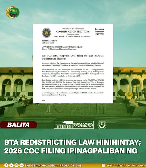 Sinuspinde ng COMELEC ang paghahain ng Certificates of Candidacy (COC) para sa March 30, 2026 Bangsamoro Parliamentary Elections dahil wala pang naipapasa na parliamentary districting law ang BTA.