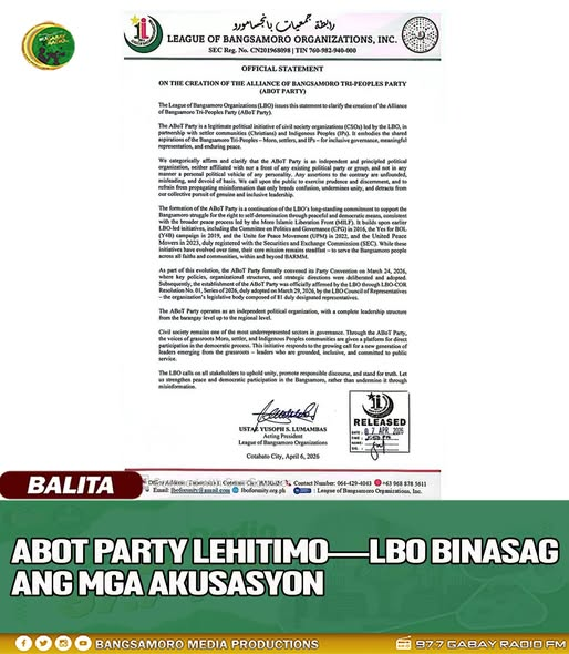 Naglabas ng opisyal na pahayag ang League of Bangsamoro Organizations upang linawin ang usapin hinggil sa pagkakatatag ng Alliance of Bangsamoro Tri-Peoples Party (ABoT Party).