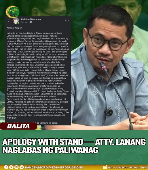 Naglabas ng pahayag si MP Atty. Lanang bilang tugon sa kontrobersiyang kinasasangkutan niya kaugnay ng naging pahayag ni Interim Chief MInister Abdulraof Macacua, kung saan inilahad umano ang sama ng loob at paghahambing sa kanya sa isang “munafik.”