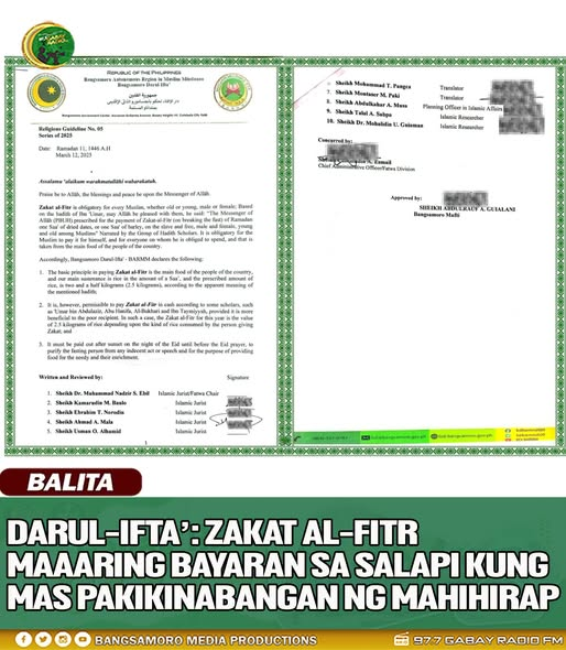 Nilinaw ng Bangsamoro Darul-Ifta’ na pinahihintulutan ang pagbabayad ng Zakat al-Fitr sa anyo ng salapi… Read More