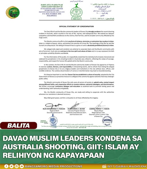 𝐃𝐀𝐕𝐀𝐎 𝐌𝐔𝐒𝐋𝐈𝐌 𝐋𝐄𝐀𝐃𝐄𝐑𝐒 𝐊𝐎𝐍𝐃𝐄𝐍𝐀 𝐒𝐀 𝐀𝐔𝐒𝐓𝐑𝐀𝐋𝐈𝐀 𝐒𝐇𝐎𝐎𝐓𝐈𝐍𝐆, 𝐆𝐈𝐈𝐓: 𝐈𝐒𝐋𝐀𝐌 𝐀𝐘 𝐑𝐄𝐋𝐈𝐇𝐈𝐘𝐎𝐍 𝐍𝐆 𝐊𝐀𝐏𝐀𝐘𝐀𝐏𝐀𝐀𝐍