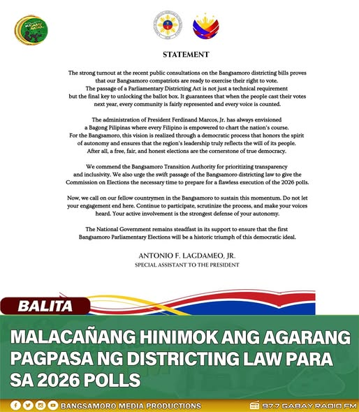 Malacañang Suportado ang Mabilis na Pagpasa ng Bangsamoro Districting Law