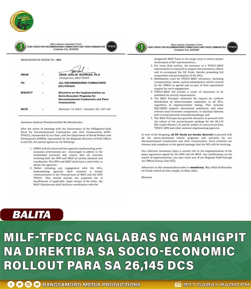MILF-TFDCC Naglabas ng Direktiba sa Pagpapatupad ng Socio-Economic Programs para sa 26,145 Decommissioned Combatants